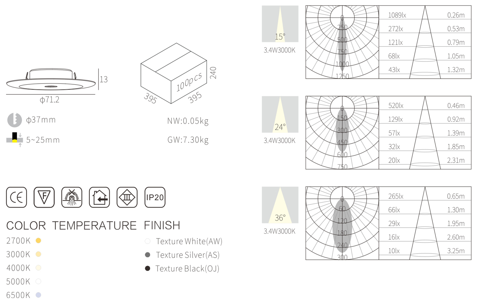 2700K/3000k/4000kBeam angle: